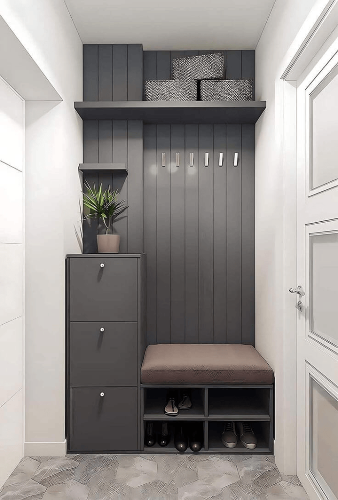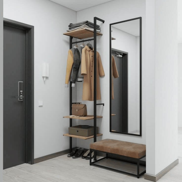 Прихожая – компактная и удобная модель с крючками, открытыми полками и нижним отсеком для обуви. Практичное решение для аккуратного хранения в современном интерьере.