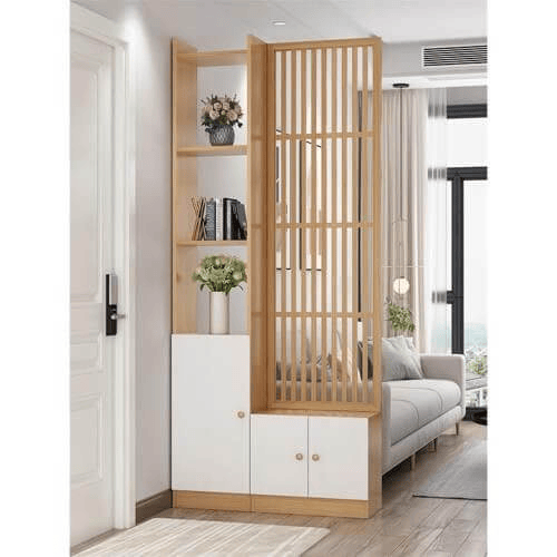 Прихожая – функциональная модель с открытыми полками, крючками для одежды и вместительными отделениями для хранения. Комбинация светлых фасадов и древесной текстуры создаёт современный и уютный вид.
