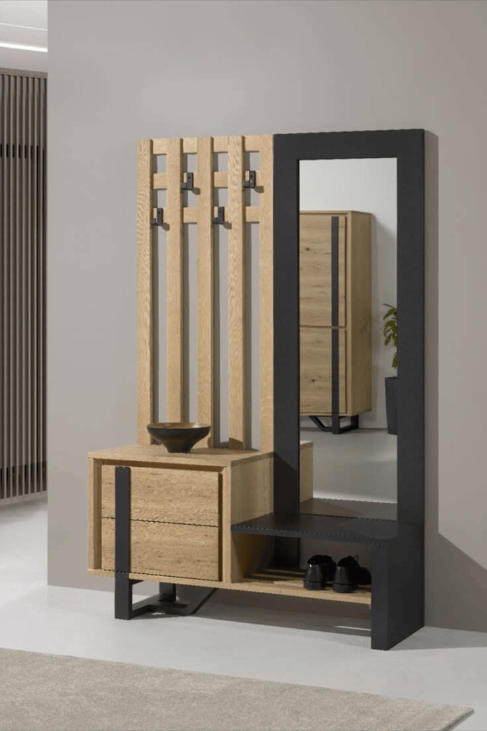 Прихожая Oslo — Стильная и функциональная прихожая с удобной банкеткой, открытыми полками и выдвижными секциями для хранения обуви и аксессуаров. Практичное решение для современного интерьера.
