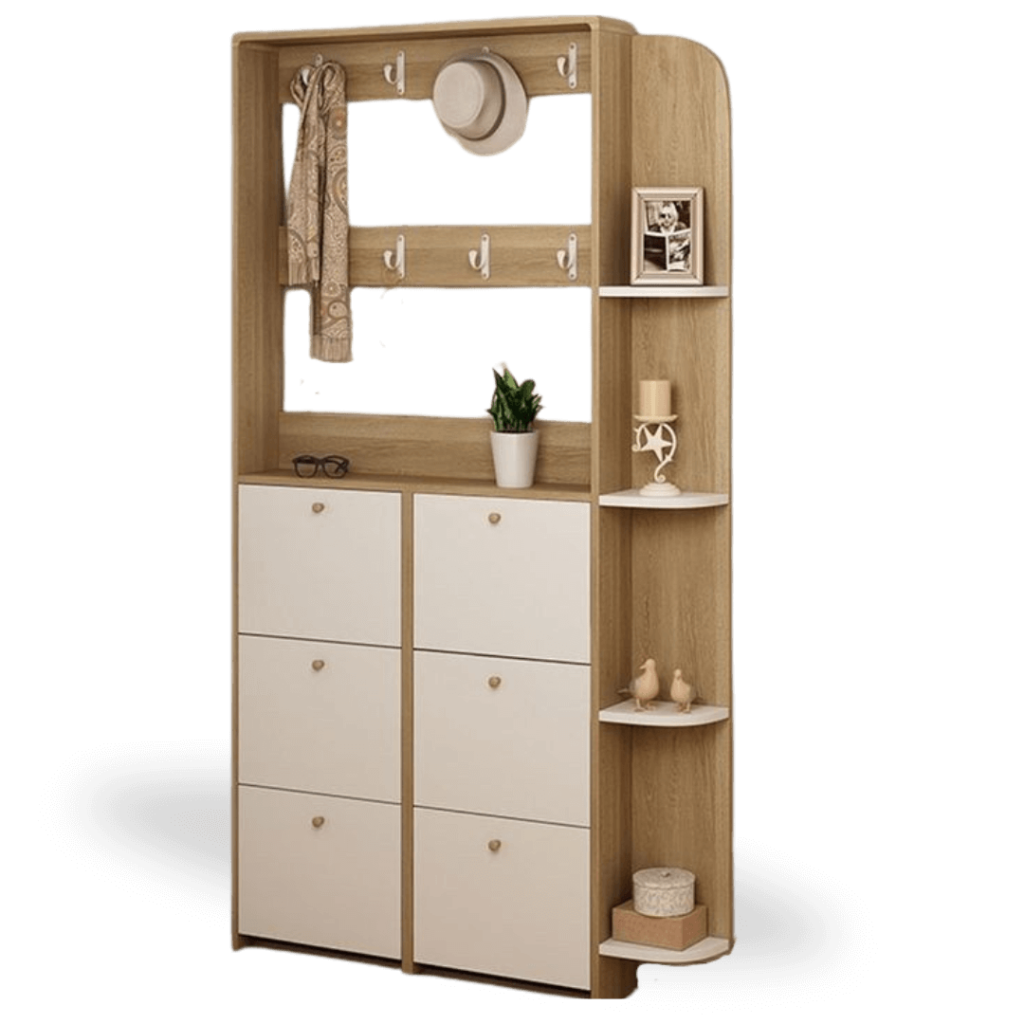 Прихожая в современном стиле – компактная и удобная модель с открытыми полками и шкафчиком для хранения. Практичные крючки и верхняя полка обеспечивают функциональность в ежедневном использовании.