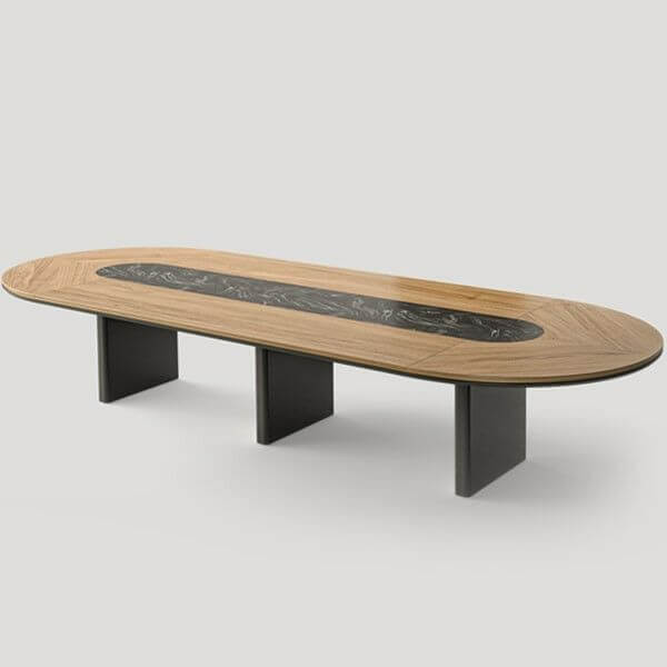 Переговорный стол — элегантная модель с овальной столешницей и декоративной центральной вставкой. Широкая поверхность и прочные опоры обеспечивают комфорт при деловых встречах и современный акцент в интерьере.