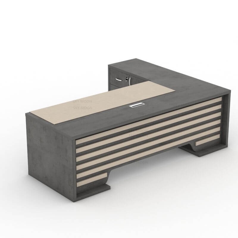 Стол руководителя — стильная и массивная модель с современным дизайном. Контраст текстур, декоративные горизонтальные рейки и удобная боковая тумба создают функциональное и солидное рабочее пространство.