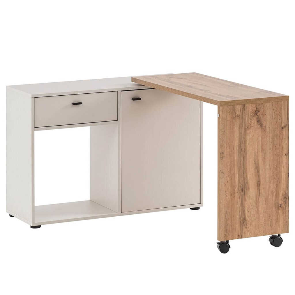 Офисный стол-трансформер — практичное решение для небольших пространств. Поворотная столешница на роликах позволяет легко изменять форму стола, а встроенные полки и выдвижной ящик обеспечивают удобное хранение документов и аксессуаров.